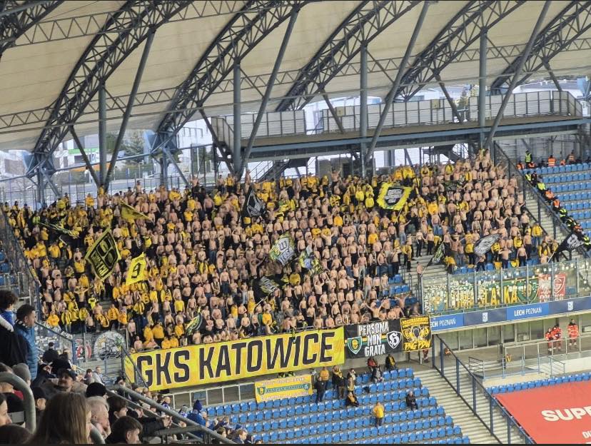 Wokalnie jednak wypadli średnio. Z takim potencjałem i od takiej marki powinno wymagać się więcej. Najgłośniejsi byli podczas przyłączania się do dopingu Lechitów z pozostałych trybun, po strzelonych bramkach. Wtedy i tyko wtedy ich wokal przenikał przez nasz sektor. Przez pozostałą część meczu nasza, odróżniająca się od reszty widowni grupa, udowadniała to, o czym się mówi od dawna, że to Ślązacy najlepiej dopingują w tym kraju! Choć potencjałem nie dorównywaliśmy gospodarzom, stanowiąc może 1/10 mocy ich gardeł, to determinacją i głośnym śpiewem nie ugięliśmy się nawet na chwilę. Przez chwilę śpiewaliśmy nawet bez koszulek. Pomagała nam w tym gra naszych zawodników, którzy na boisku rywala trzykrotnie wychodzili na prowadzenie, fundując nam drugi raz w tym tygodniu kosmiczny mecz. Ponieważ Poznaniacy za każdym razem odrabiali straty, emocje sięgały zenitu, a gra Katowiczan do końca napełniała nas coraz większą wiarą, że uda się wywieźć z Bułgarskiej komplet punktów. Tak się ostatecznie nie stało i mecz zakończył się remisem, lecz to, co prezentuje sobą drużyna Rafała Góraka w drugim sezonie pobytu w ekstraklasie, to cos fenomenalnego.
