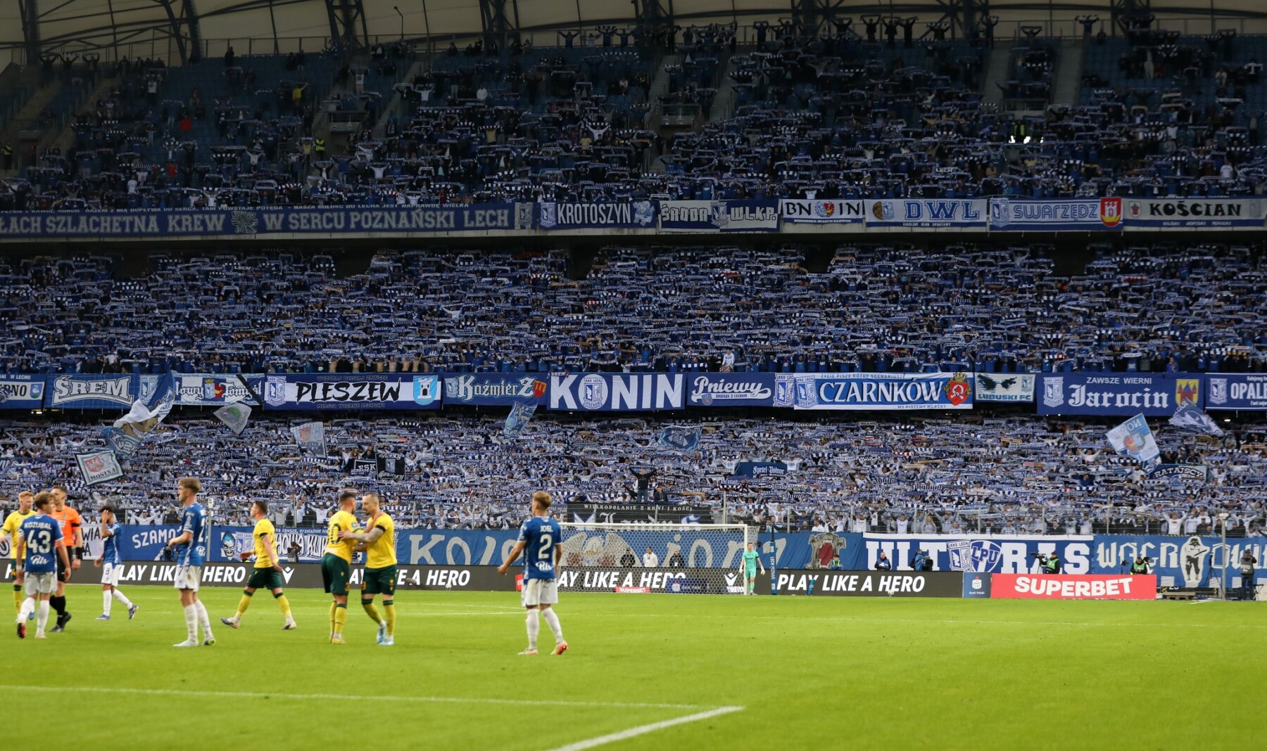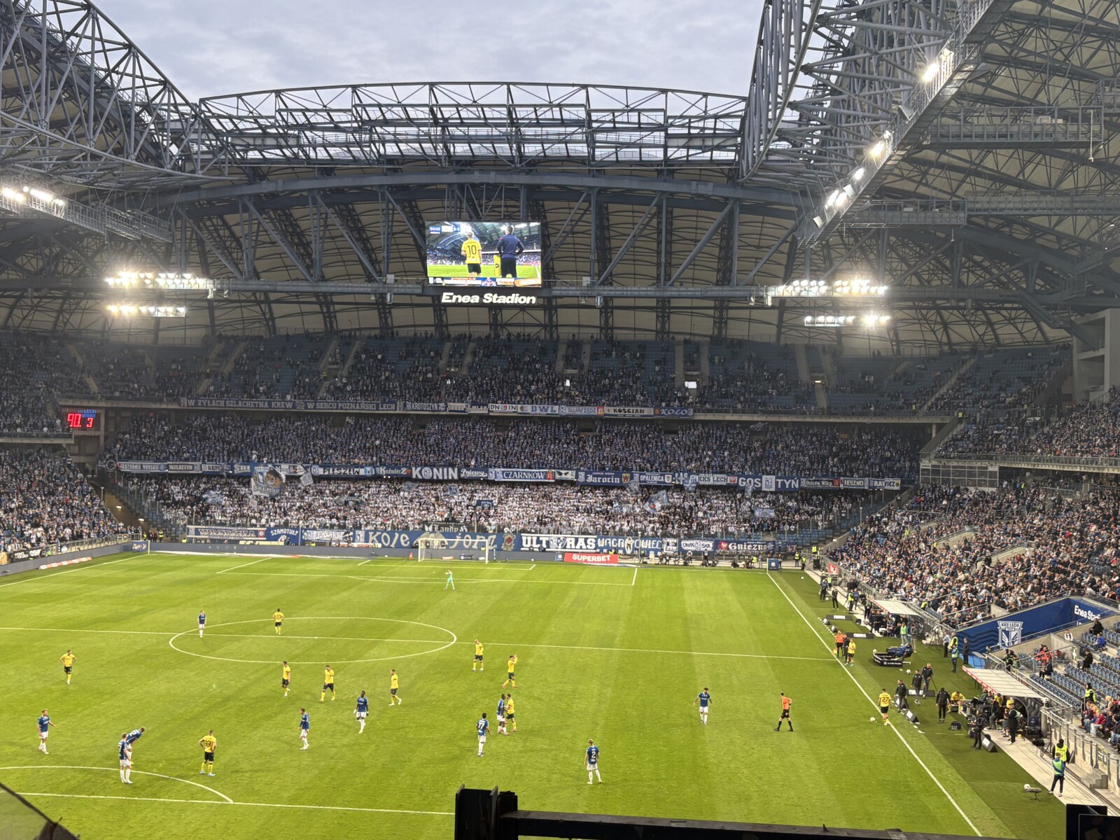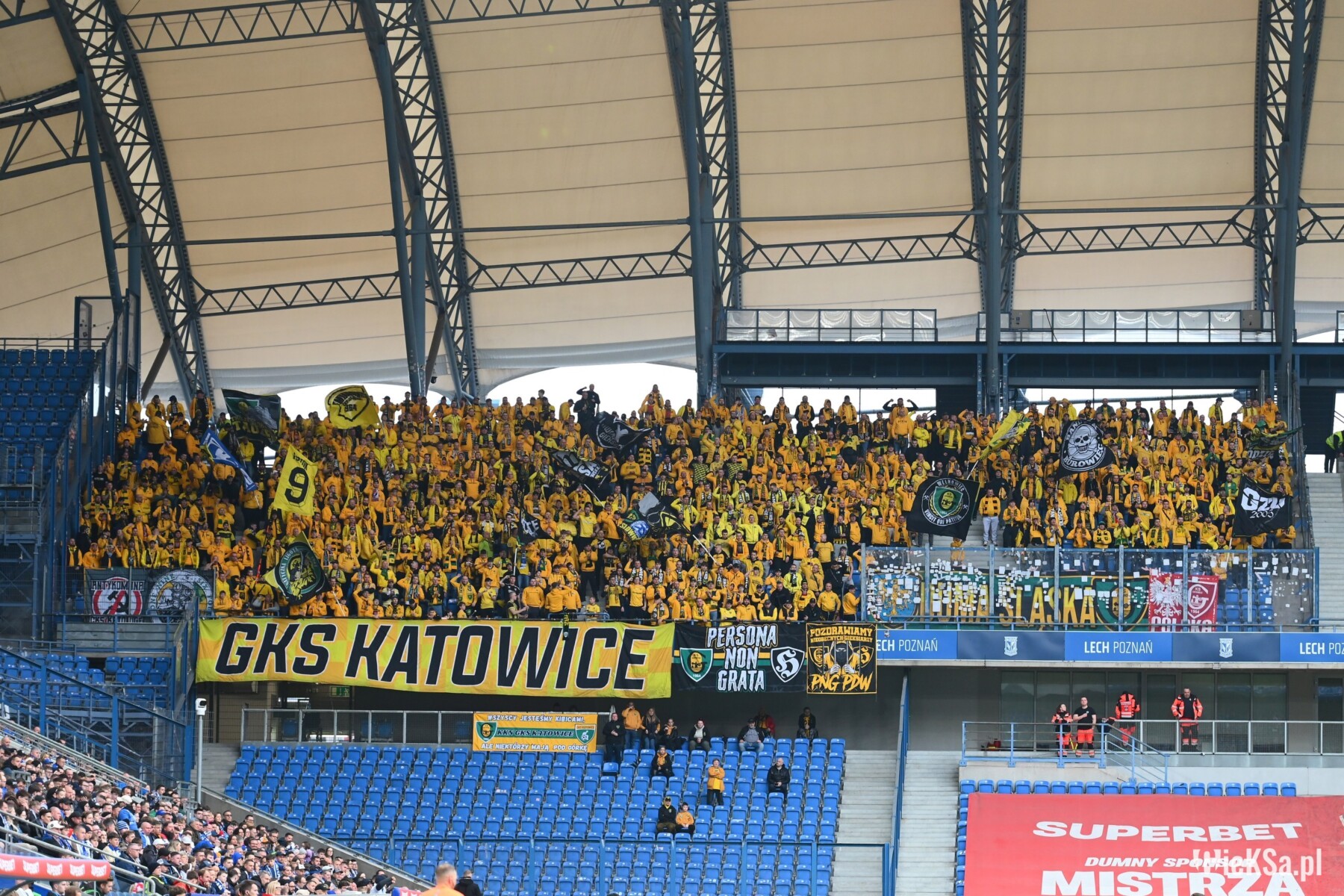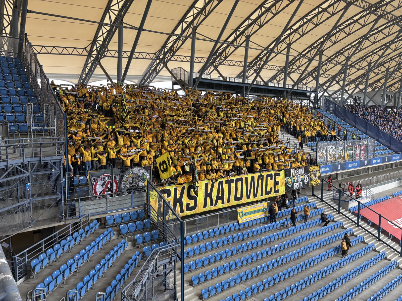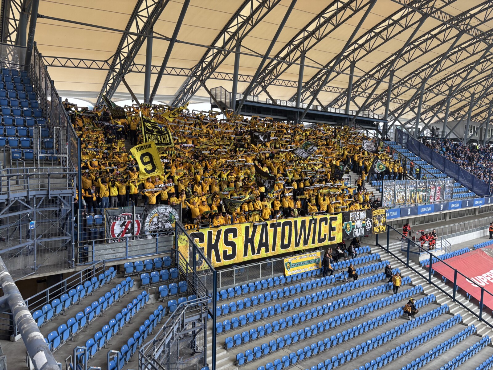 Pod poznański stadion dotarliśmy po niespełna 6 godzinach drogi, więc do rozpoczęcia mieliśmy godzinny zapas, co w zupełności wystarczyło, by każdy z nas spokojnie wszedł na sektor. W sumie było nas 740 osób, w tym dwóch kibiców Banika Ostrava oraz jeden JKS-u Jarosław – dzięki. Wszyscy ubrani byliśmy na żółto, a na wyposażeniu mieliśmy 7 flag i 13 chorągwi. Zajęliśmy górne miejsca w sektorze gości po stronie trybuny im. Edmunda Białasa ps. Kosiba, który należał niegdyś do słynnego tercetu napastników Kolejorza „A-B-C” i był pierwszym zawodnikiem Lecha, który wystąpił w reprezentacji Polski. Pozostałe trybuny, oprócz „Kotła”, również noszą imiona zawodników z tercetu A-B-C: Teodora Anioły i Henryka Czapczyka. Patronat ten nadano 28 lutego 2013.